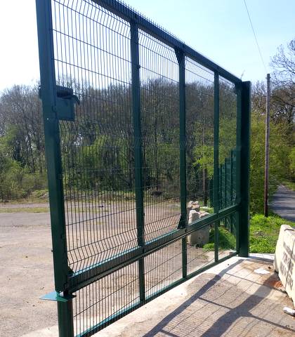 These bespoke 8-metre wide mesh gates were designed and installed to accommodate articulated lorry access to a large storage yard. With uneven ground across the entrance area, we custom fabricated underhangs for both gate leaves - ensuring a smooth and functional open/close action without compromising ground clearance or gate strength.